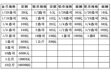 中國(guó)人民銀行自2000年發(fā)行 “千年紀(jì)念”金銀幣開始,規(guī)范統(tǒng)一了貴金屬紀(jì)念幣各種材質(zhì)的規(guī)格品種與其標(biāo)注面額的標(biāo)準(zhǔn)。具體見(jiàn)下表: