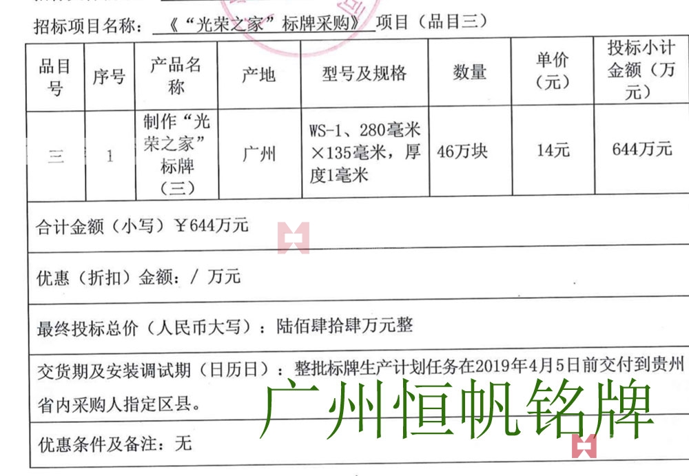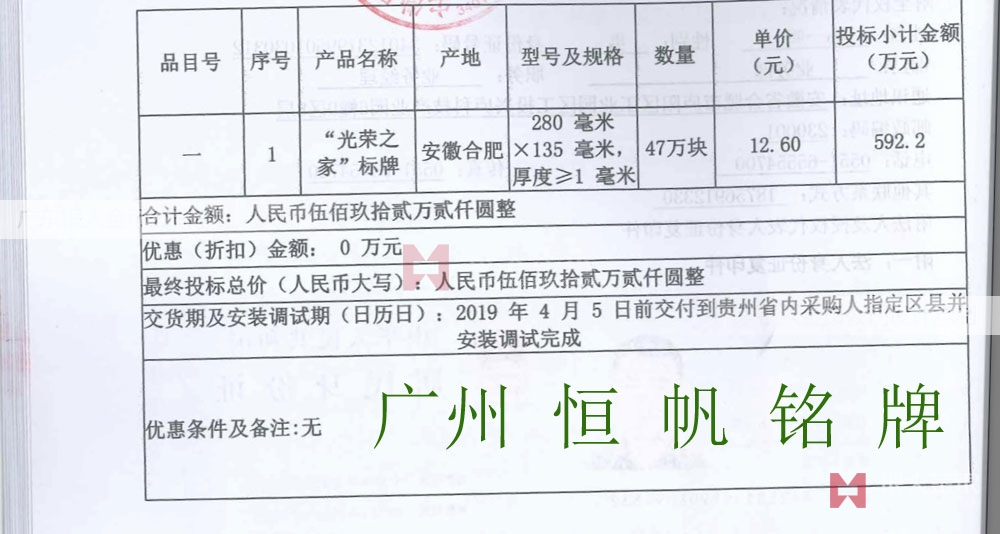 光榮牌制作樣品1塊(標明材質及成分含量)。最終交付的產(chǎn)品必須符合技術規(guī)范參數(shù)。