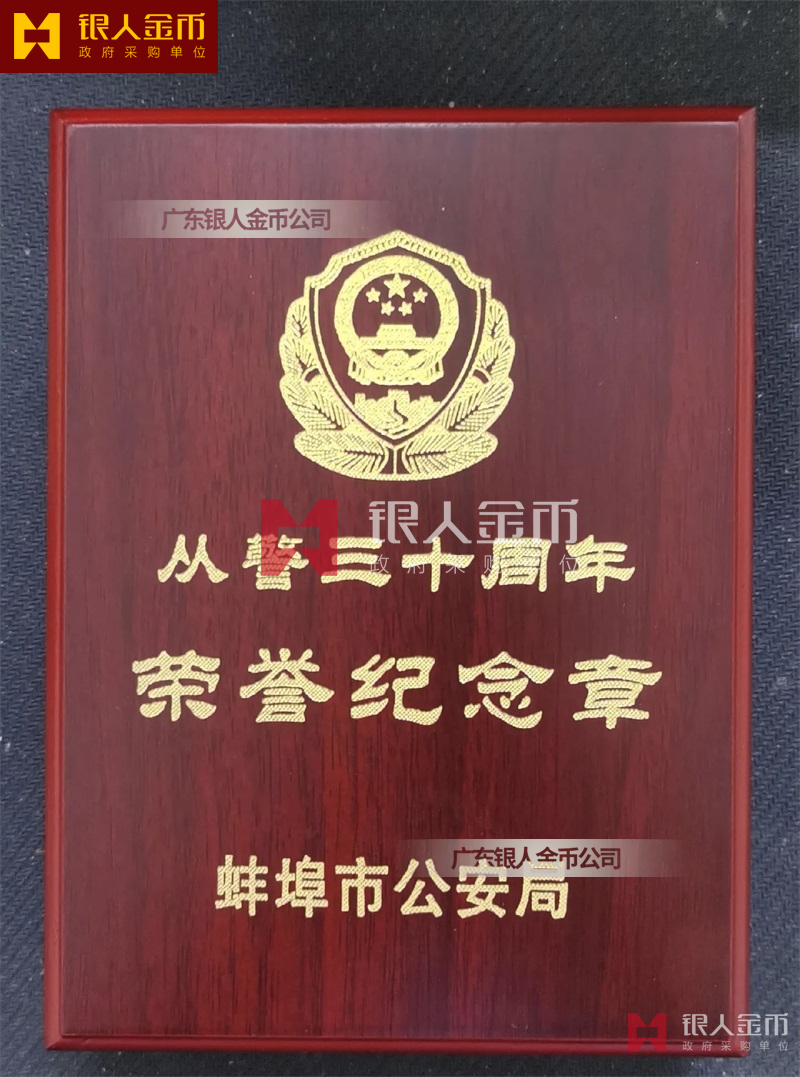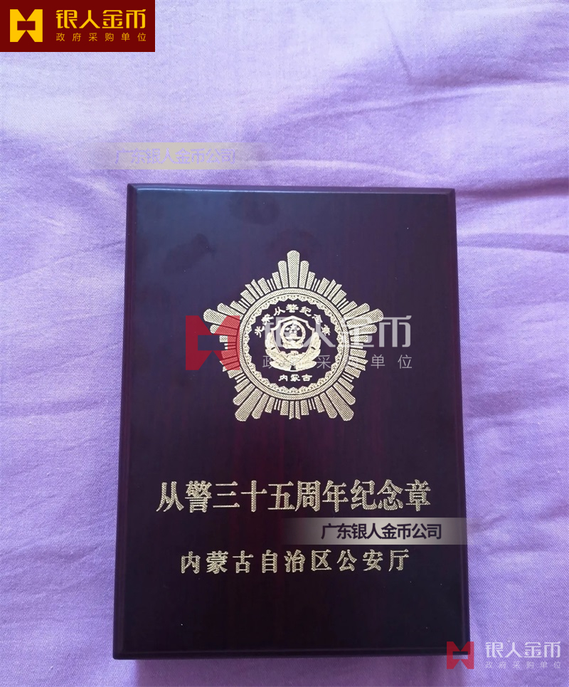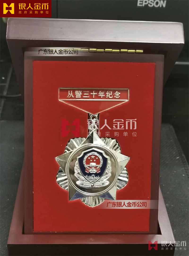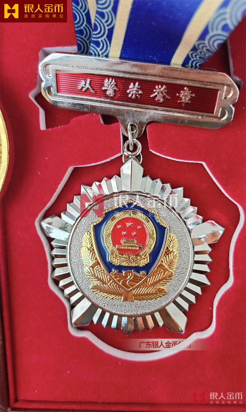 從警紀念章定制,從警年限紀念章定制,從警獎章定制——從警紀念章的底下主體部分都是警徽,上面橫檔部分是不相同的,有:“從警十年紀念(從警10年紀念章)”、“從警二十年紀念(從警20年紀念章)”、“從警三十年紀念(從警30年紀念章)”、“從警四十年紀念(從警40年紀念章)”不同的,從警十年紀念章(從警10年獎章)表面是鍍銅色(銅質(zhì)獎章)、從警二十年紀念章(從警20年獎章)表面鍍銀色(銀質(zhì)獎章)、從警三十年紀念章(從警30年獎章)和從警四十年紀念章(從警40年獎章)表面鍍金色(金質(zhì)獎章) ,整體將從警獎章或從警紀念章(從警特定年限紀念章也叫從警章)鑲嵌在三折的立式木盒上面,木盒外面配有紙盒,整體做工精美,木盒紙盒上面都刻有警徽從警年限等。