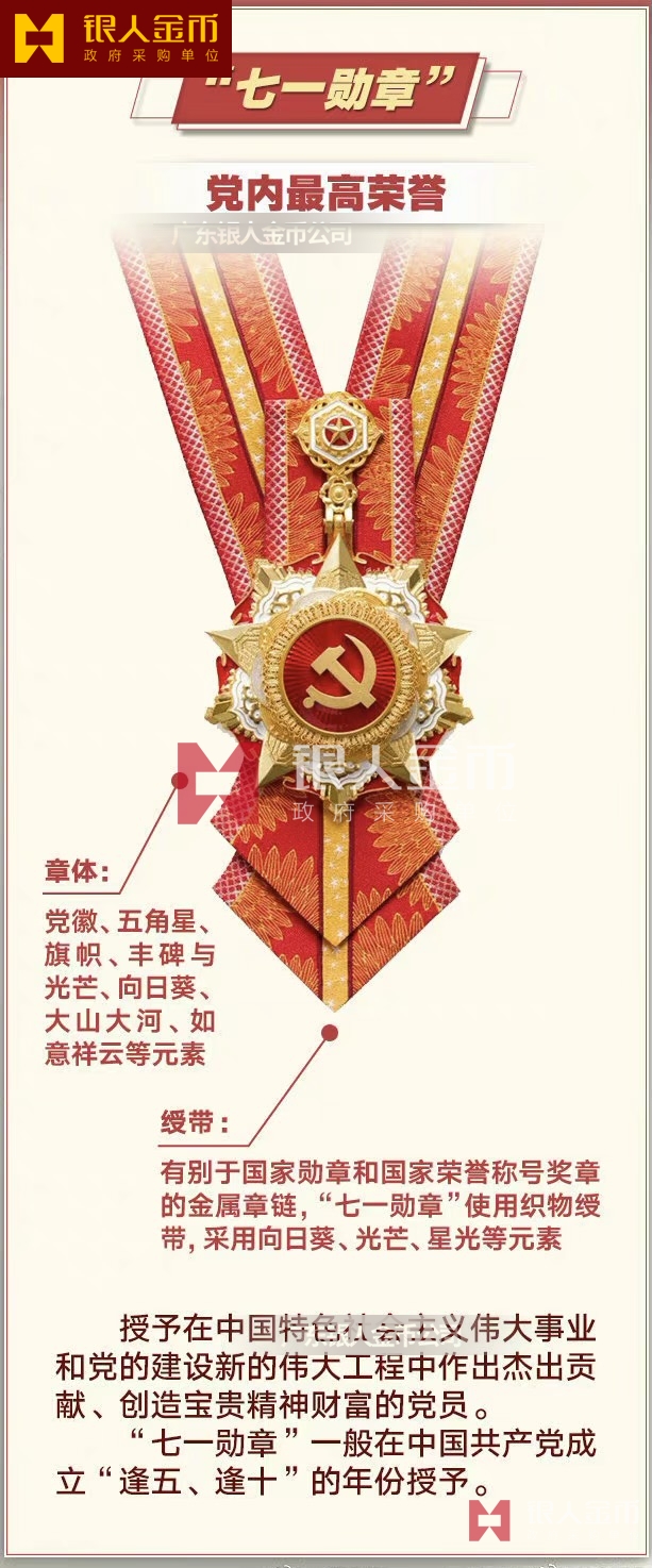 “七一勛章”是黨內(nèi)最高榮譽,以樸素、莊重為主要設計理念,以紅色、金色、白色為主色調(diào),使用冷壓成型、花絲鑲嵌、彩絲織錦等工藝制作。