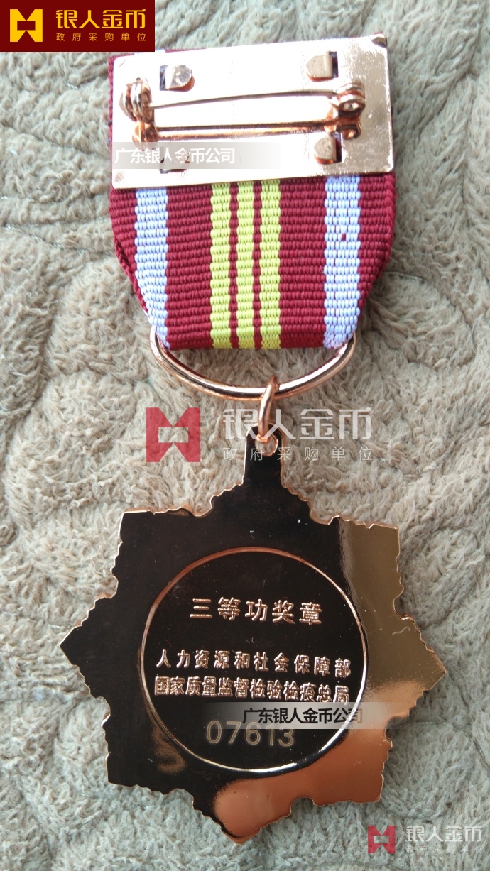 別為齒輪和綢帶圖案;外圈為五角光芒;上章鐫刻獎項名稱,分別標明一、二、三等功,采用紅色填釉工藝。獎章背后標明監(jiān)制機關名稱。綬帶為絲質,大紅色,分別用一條、二條