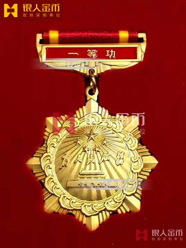 一、二、三等功獎章由銅壓制成型,分別采用鍍金、銀、銅工藝。核心區(qū)上部為五星圖案;中部為天安門圖案;下部為毛澤東同志書寫的“為人民服務”字樣,采用紅色填釉工藝;核