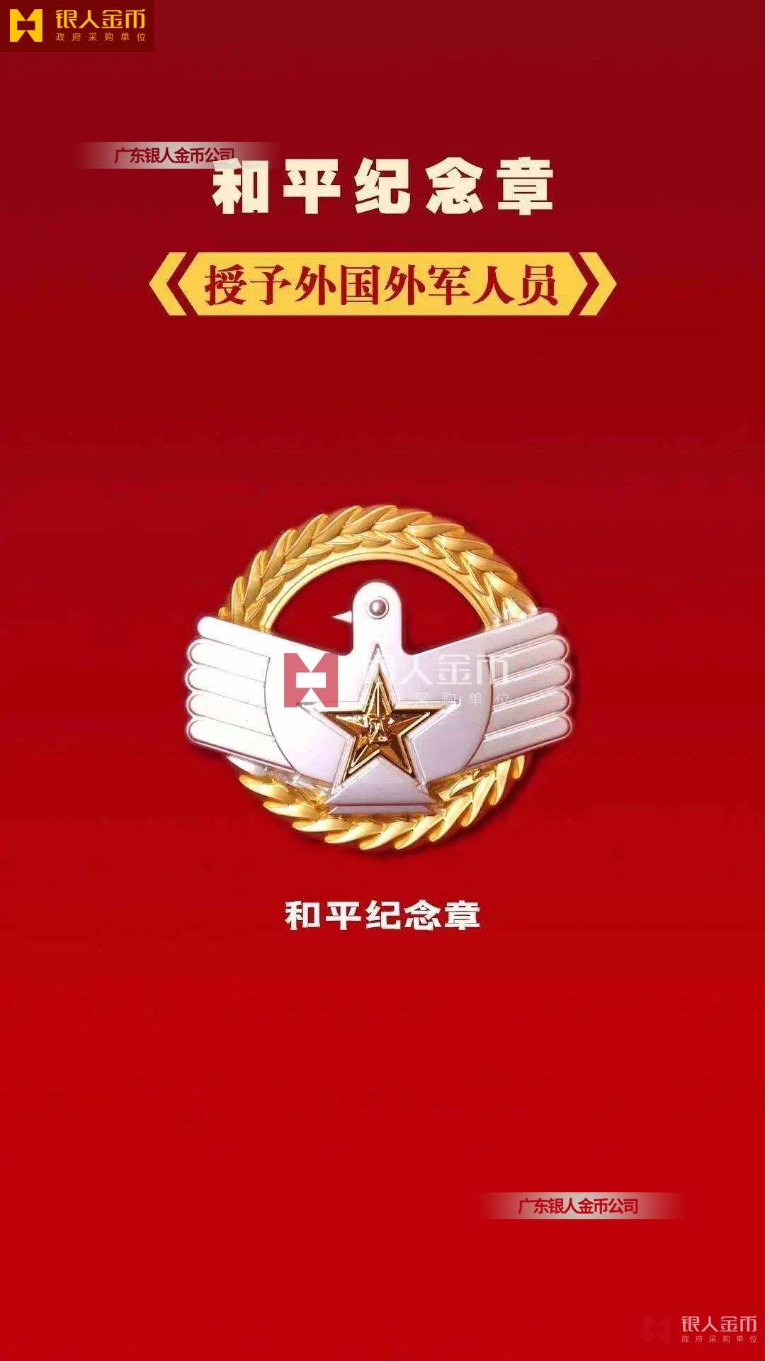 和平紀(jì)念章,由軍徽、和平鴿等元素構(gòu)成,授予外國(guó)外軍人員,通徑為35mm。
