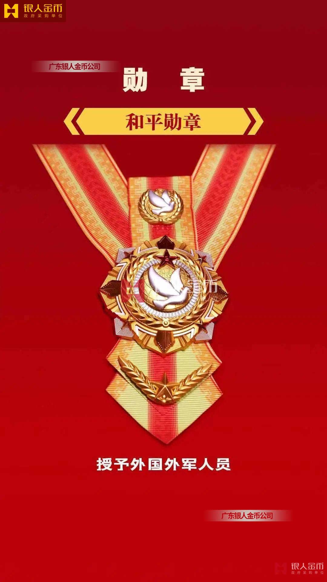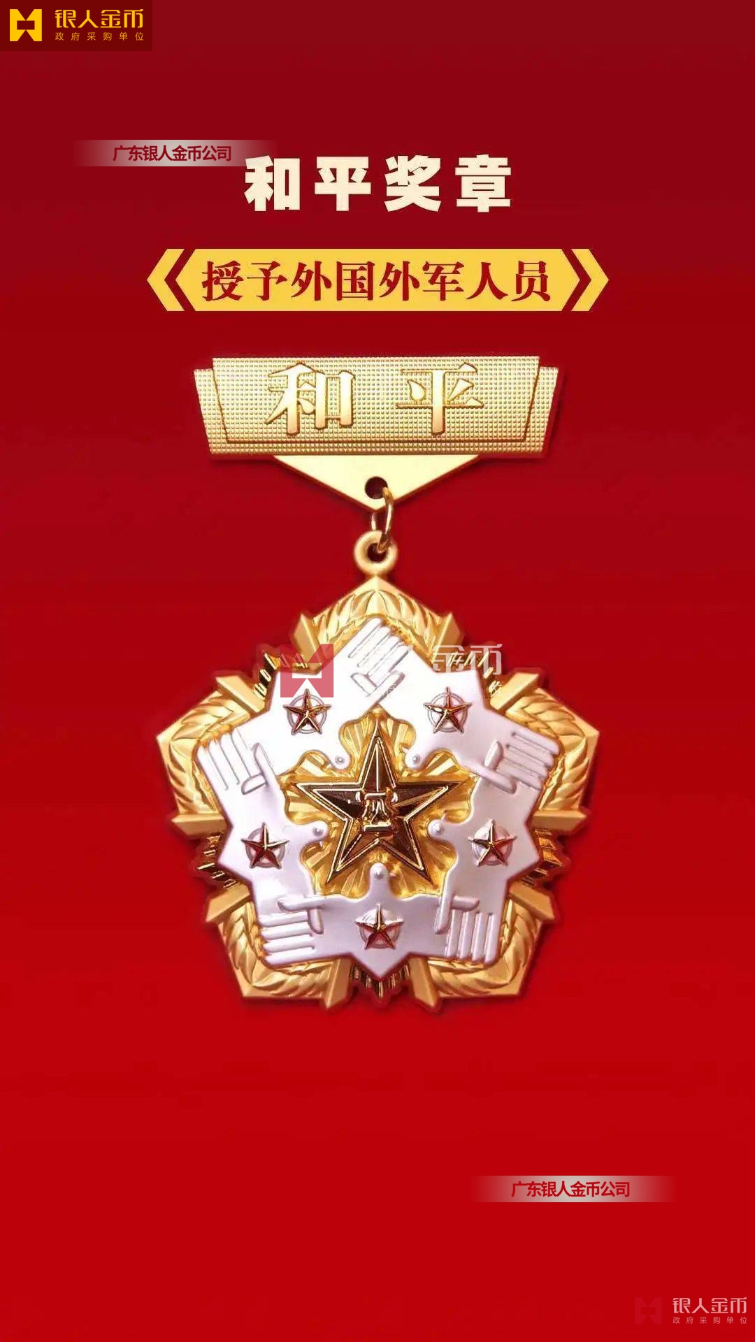和平獎(jiǎng)?wù)?,由軍徽、和平鴿、橄欖枝等元素?gòu)成,授予外國(guó)外軍人員,主章通徑為60mm。