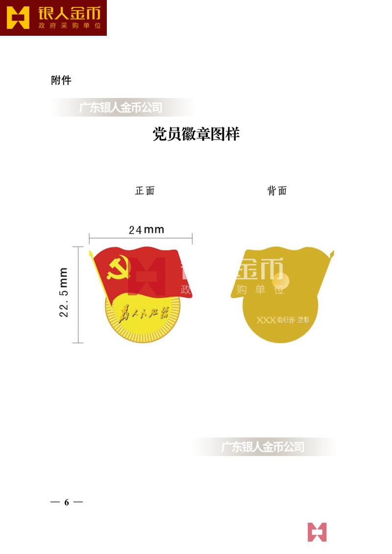 黨員徽章黨徽尺寸為 24mm×22. 5mm×2mm,材質(zhì)為鋅掛鍍仿金。