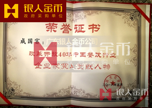 改革開放40年中國餐飲行業(yè)企業(yè)家突出貢獻(xiàn)獎金質(zhì)獎?wù)陋勁谱C書(圖)