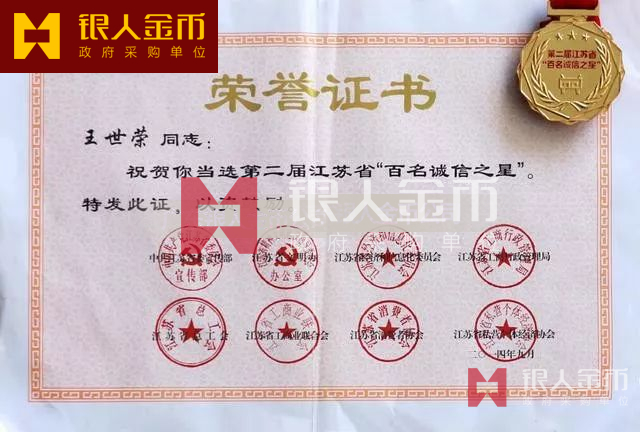 江蘇省百名誠信之星榮譽(yù)稱號獎?wù)伦C書(圖)