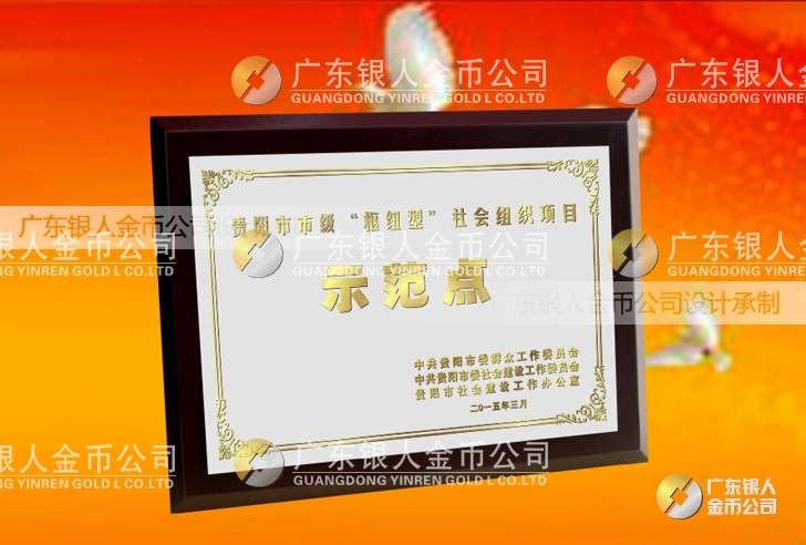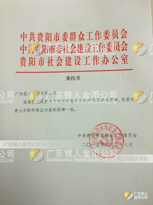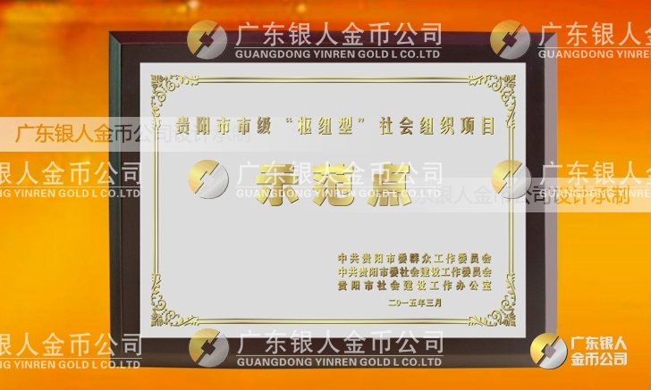 廣東銀人金幣公司設(shè)計(jì)制作承接中共貴陽市委、民政局、財(cái)政局、群工委、中共貴陽市委社會建設(shè)工作委員會、貴陽市社會建設(shè)工作辦公室表彰樞紐型社會組織項(xiàng)目榮譽(yù)獎狀、先進(jìn)集體獎牌、先進(jìn)單位獎牌、先進(jìn)個(gè)人牌匾、高檔鈦金獎牌定制。
