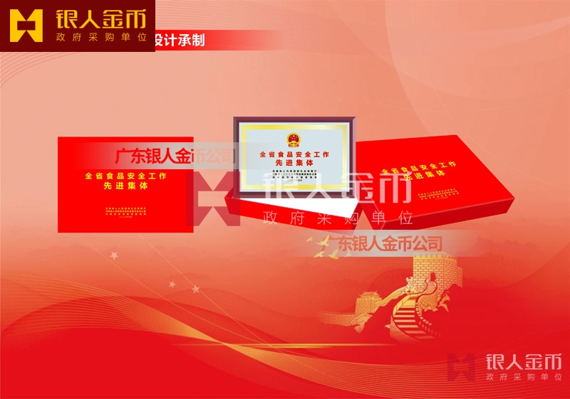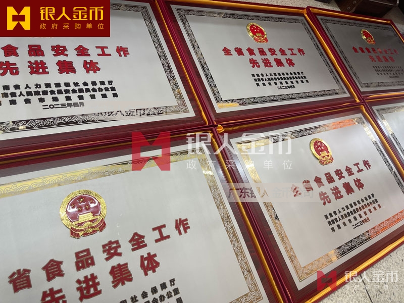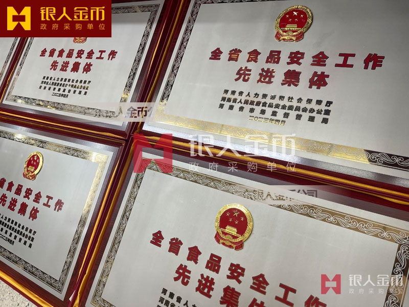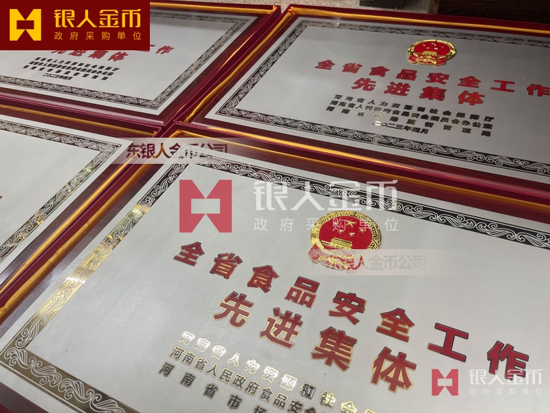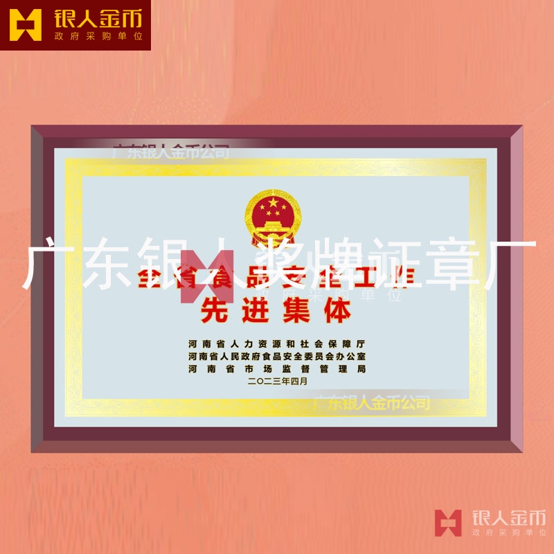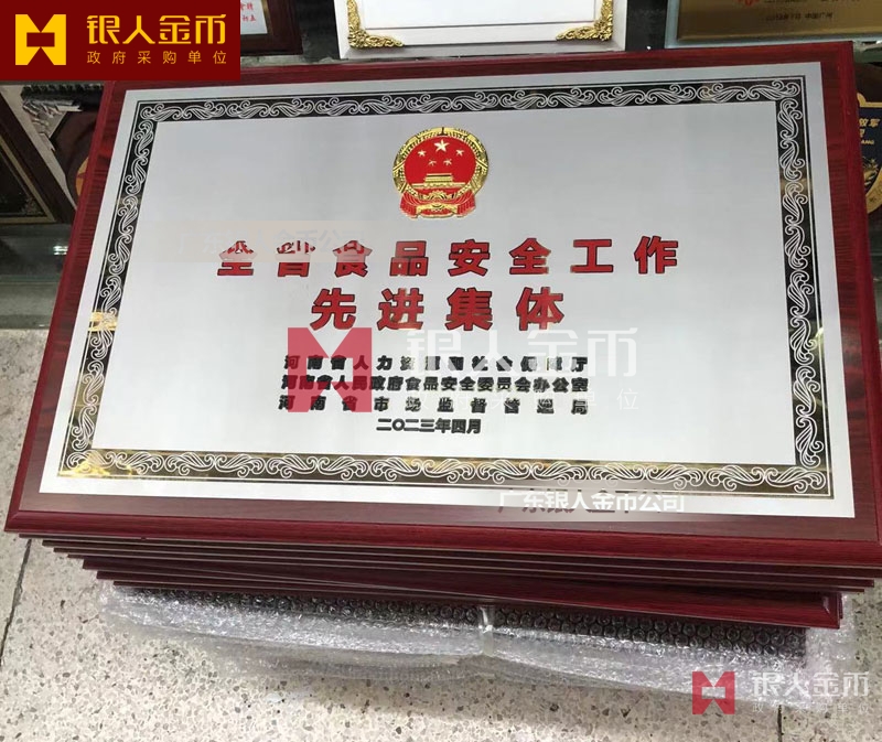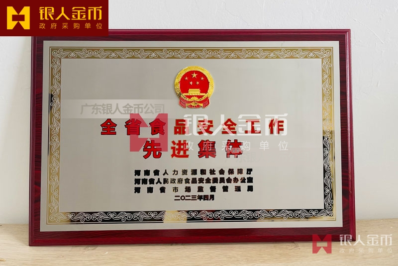 河南省政府食品安全工作先進集體獎牌定制_全省食品安全工作表彰牌匾制作_獎勵牌匾訂制_先進集體木板底托銅牌制做_貼紅木板鈦金獎牌定做_貼紅木仿紅木托底鈦金牌匾額匾牌