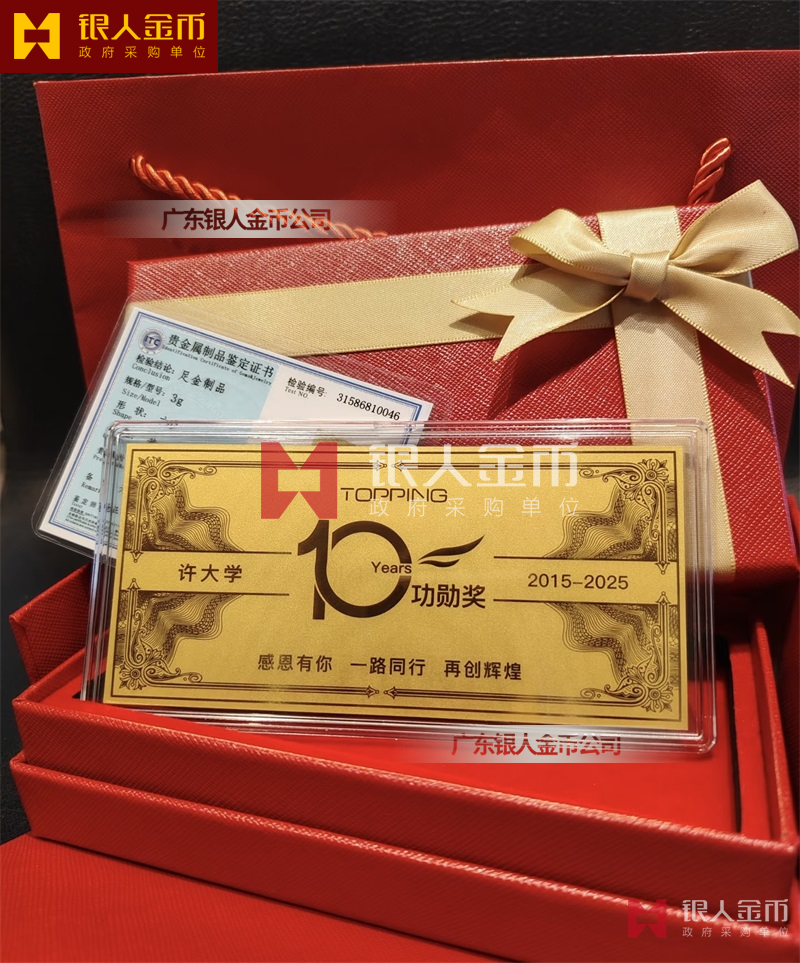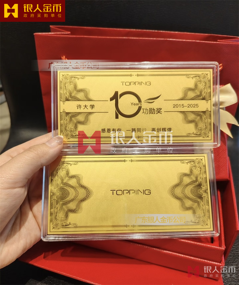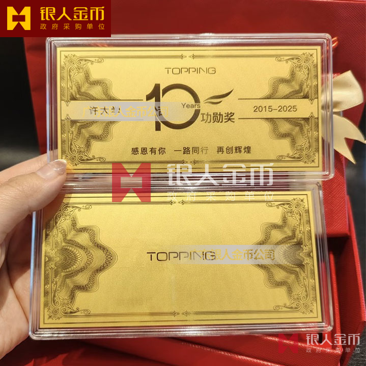 杭州TOPPING公司黃金金鈔定制_員工入職10周年功賀獎金卡定制_員工工作滿10年金牌定制_10年員工金子定制_入職紀念金鈔定制